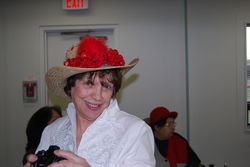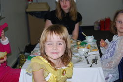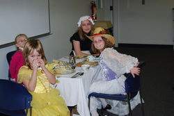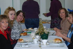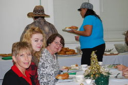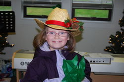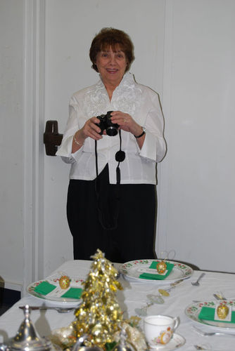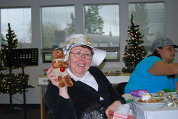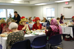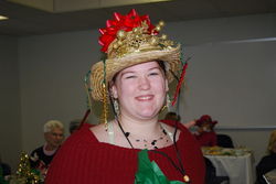 We have a tradition of wearing a fun hat ...it can be formal or just a kick! We have a parade of hats an ornament game exchange ...door prizes and carols it is always fun... This year the little galls had their own table and my grandaughter Thea was their table hostess